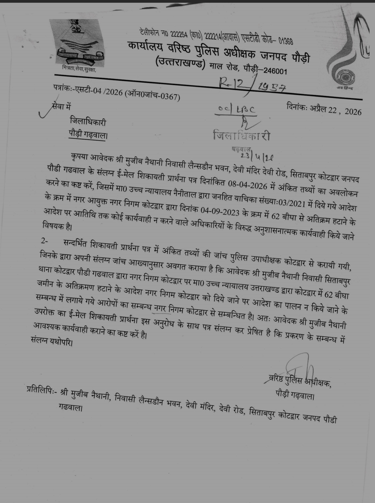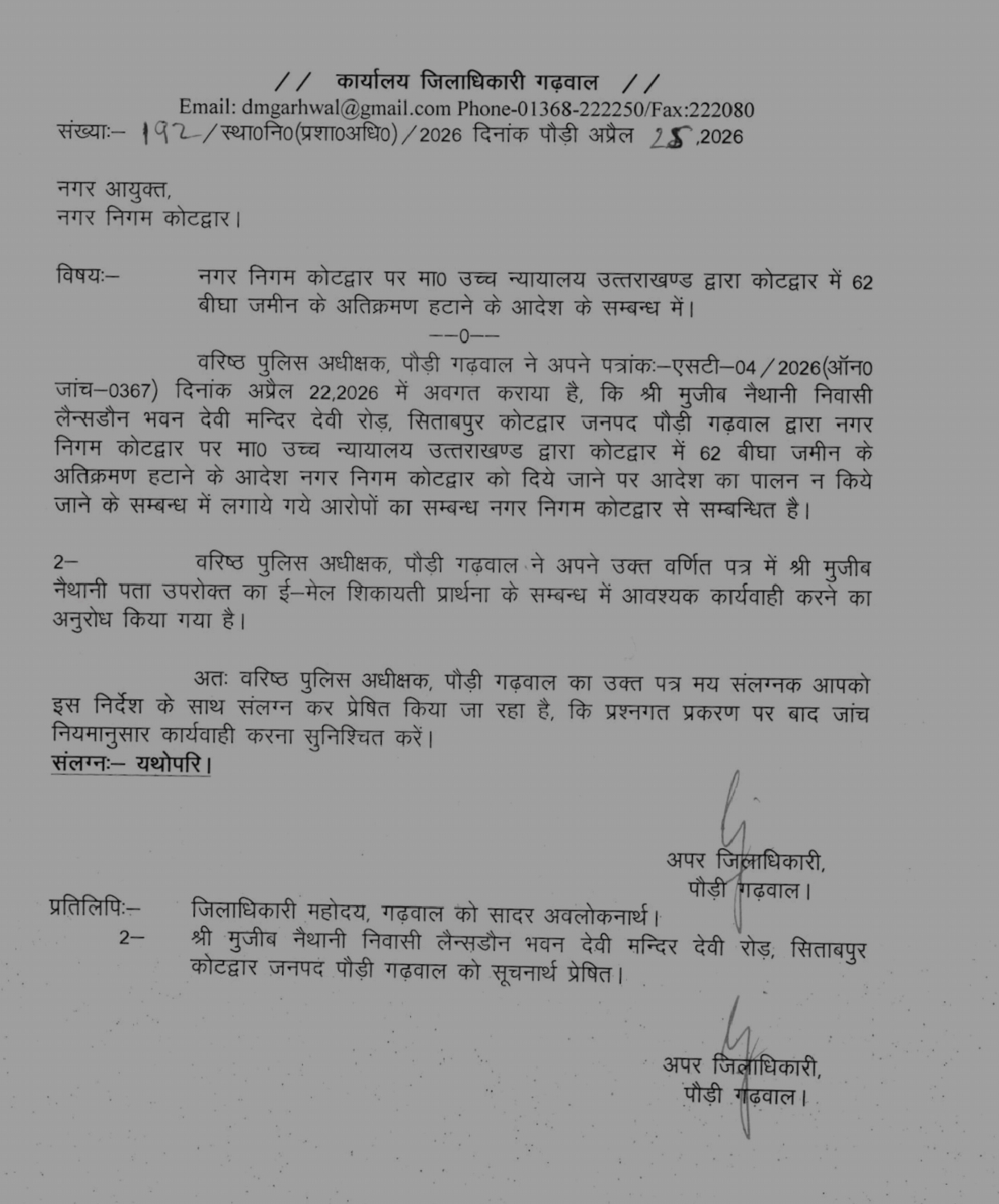 वरिष्ठ पुलिस अधीक्षक, पौड़ी गढ़वाल ने अपने पत्रांकः एसटी-04/2026 (ऑन0 जांच-0367) अप्रैल 22,2026 में अवगत कराया है, कि मुजीब नैथानी निवासी लैन्सडौन भवन देवी मन्दिर देवी रोड़, सिताबपुर कोटद्वार जनपद पौड़ी गढ़वाल द्वारा नगर निगम कोटद्वार पर उच्च न्यायालय उत्तराखण्ड द्वारा कोटद्वार में 62 बीघा जमीन के अतिक्रमण हटाने के आदेश नगर निगम कोटद्वार को दिये जाने पर आदेश का पालन न किये जाने के सम्बन्ध में लगाये गये आरोपों का सम्बन्ध नगर निगम कोटद्वार से सम्बन्धित है।