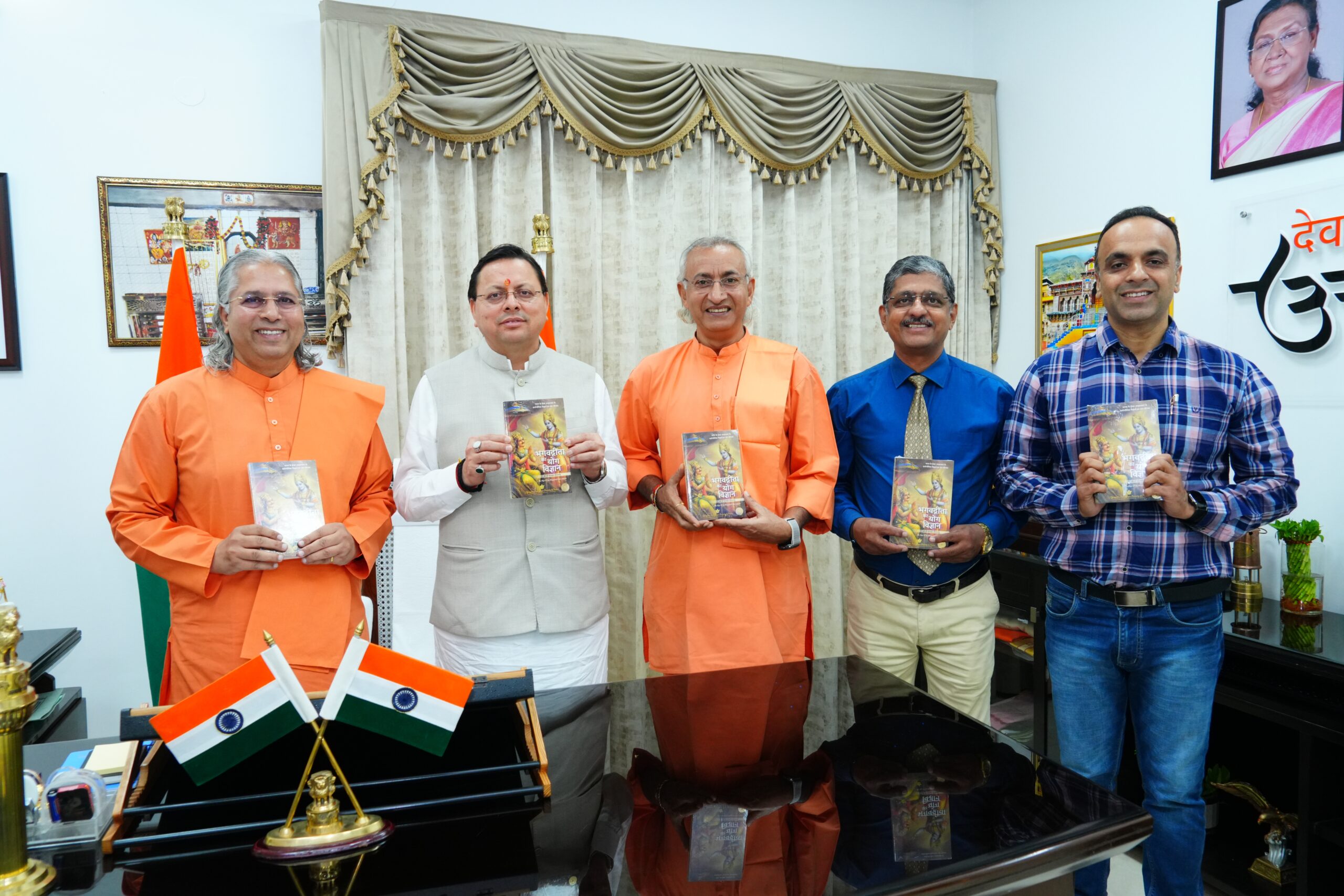 फोटो परिचय। मुख्य मंत्री पुष्कर सिंह धामी परमहंस योगानंद की पुस्तक “भगवतगीता का योग विज्ञान” का विमोचन करते। साथ में योगदा के सन्यासी स्वामी वासुदेवा नंद दाएँ और स्वामी धैर्यानंद बांये।