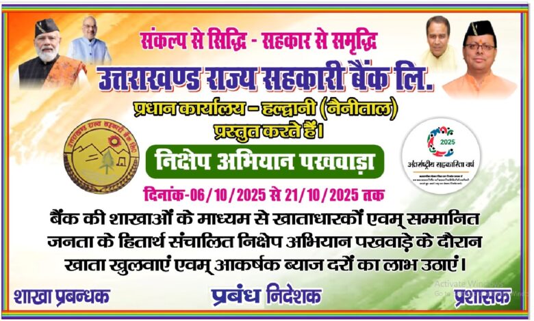 सहकारिता मंत्री डॉ. धन सिंह रावत के निर्देशन एवं प्रेरणा से उत्तराखण्ड राज्य सहकारी बैंक लिमिटेड द्वारा 06 अक्टूबर से 21 अक्टूबर 2025 तक “निक्षेप अभियान पखवाड़ा” का आयोजन किया जा रहा है।