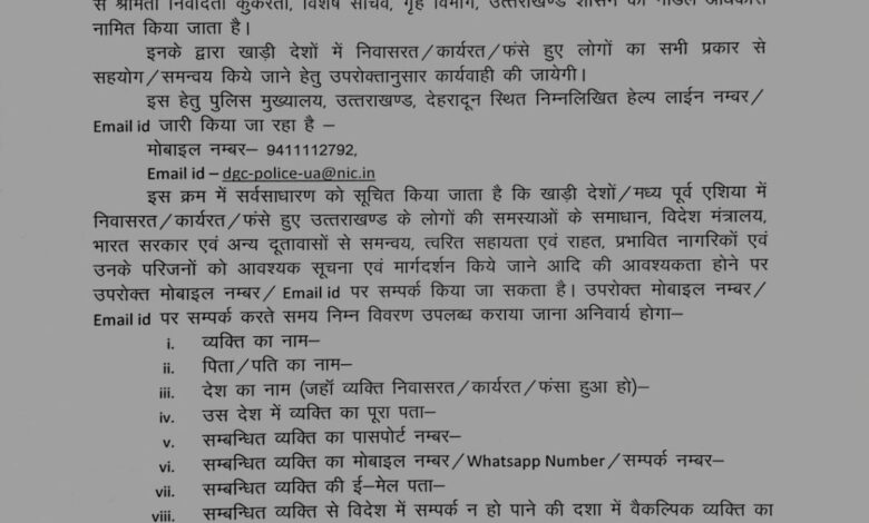 इस क्रम में सर्वसाधारण को सूचित किया जाता है कि खाड़ी देशों / मध्य पूर्व एशिया में निवासरत/कार्यरत/फंसे हुए उत्तराखण्ड के लोगों की समस्याओं के समाधान, विदेश मंत्रालय, भारत सरकार एवं अन्य दूतावासों से समन्वय, त्वरित सहायता एवं राहत, प्रभावित नागरिकों एवं उनके परिजनों को आवश्यक सूचना एवं मार्गदर्शन किये जाने आदि की आवश्यकता होने पर उपरोक्त मोबाइल नम्बर / Email id पर सम्पर्क किया जा सकता है। उपरोक्त मोबाइल नम्बर /Email id पर सम्पर्क करते समय निम्न विवरण उपलब्ध कराया जाना अनिवार्य होगा-