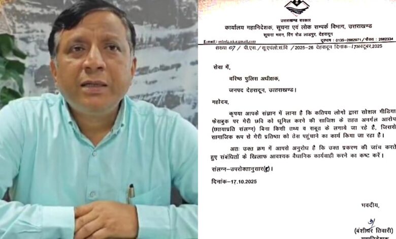 देहरादून। सूचना विभाग के महानिदेशक बंशीधर तिवारी ने वरिष्ठ पुलिस अधीक्षक को दी एक तहरीर में कहा है कि आपके संज्ञान में लाना है कि कतिपय लोगो द्वारा सोशल मीडिया फेसबुक पर मेरी छवि को धूमिल करने की साजिश के तहत्त अनर्गल आरोप (छायाप्रति संलग्न) बिना किसी तथ्य व सबूत के लगाये जा रहे है, जिससे सामाजिक रूप से मेरी प्रतिष्ठा को ठेस पहुंचाने का कार्य किया जा रहा है।