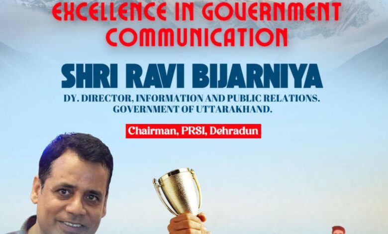 देहरादून। सूचना विभाग के उप निदेशक रवि बिजारनिया को पीआरएसआई (PRSI) एक्सीलेंस इन गवर्नमेंट कम्युनिकेशन के लिए चयनित किया गया है।