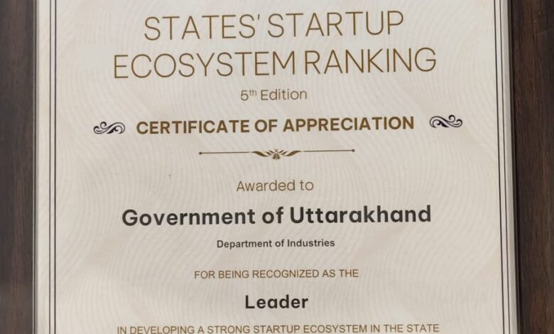भारत सरकार के वाणिज्य एवं उद्योग मंत्रालय के अंतर्गत उद्योग संवर्धन एवं आंतरिक व्यापार विभाग (DPIIT) द्वारा जारी States’ Startup Ecosystem Ranking (5वां संस्करण) में उत्तराखण्ड को मजबूत स्टार्टअप इकोसिस्टम विकसित करने में ‘लीडर’ के रूप में मान्यता प्रदान की गई है। इस उपलब्धि के लिए राष्ट्रीय स्टार्टअप दिवस के अवसर पर उत्तराखण्ड सरकार के उद्योग विभाग को Certificate of Appreciation प्रदान किया गया।